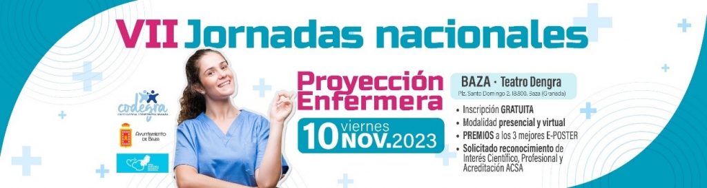 El Colegio de Enfermería de Granada, junto con el Área de Gestión Sanitaria Nordeste de Granada, todos los centros hospitalarios y áreas sanitarias de la provincia de Granada, y la colaboración del Ayuntamiento de Baza, organiza las VII Jornadas Nacionales de ‘Proyección Enfermera’, que se celebrará el día 10 de noviembre de 2023 en el Teatro Dengra de Baza (Granada), en modalidad presencial y virtual.