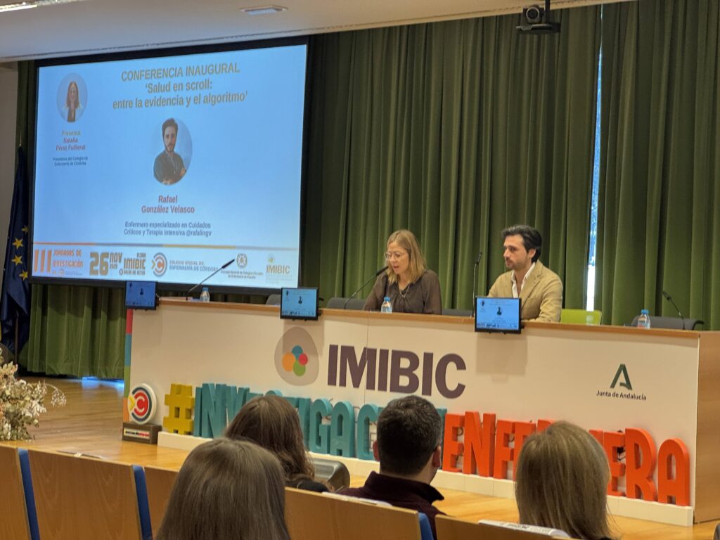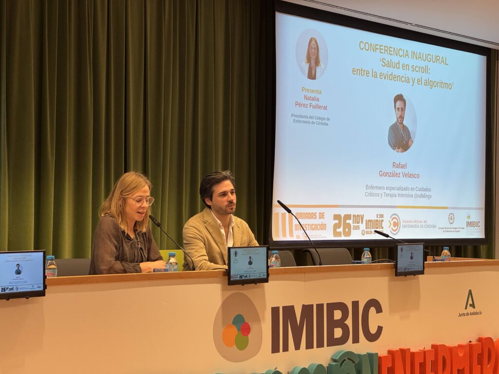 Tras la inauguración oficial, se ha dado paso a la conferencia inaugural, donde el enfermero cordobés del Hospital Universitario Reina Sofía de Córdoba y docente de la Facultad de Medicina y Enfermería de la UCO Rafael González Velasco, especializado en cuidados críticos para adultos, instructor de SVA y divulgador de cuidados, ha abordado el tema de cómo comunicar evidencia enfermera teniendo en cuenta el impacto de los algoritmos que utilizan las redes sociales y los nuevos espacios virtuales.